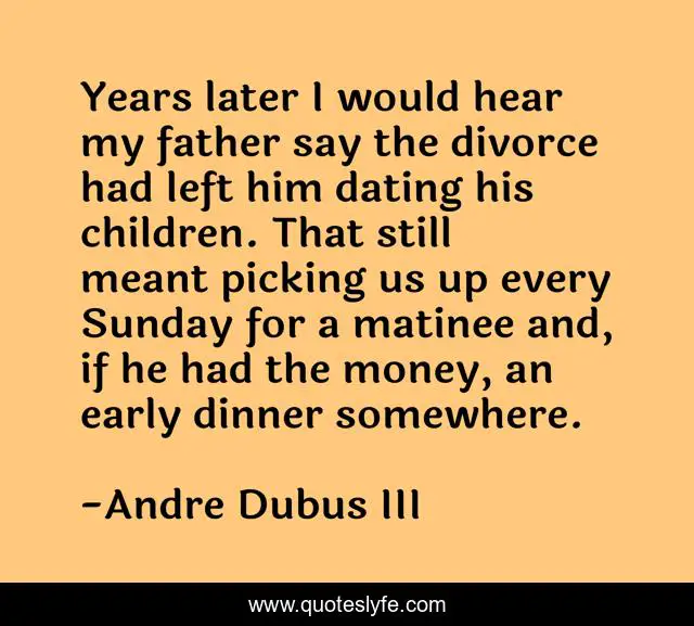 This page presents the quote "Years later I would hear my father say the divorce had left him dating his children. That still meant picking us up every Sunday for a matinee and, if he had the money, an early dinner somewhere.". Author of this quote is Andre Dubus III. This quote is about money, father, children,.