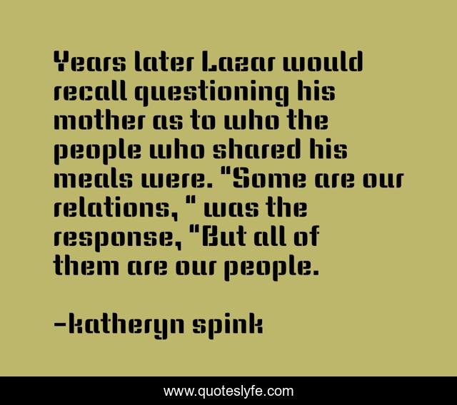 This page presents the quote "Years later Lazar would recall questioning his mother as to who the people who shared his meals were. "Some are our relations, " was the response, "But all of them are our people.". Author of this quote is katheryn spink. This quote is about community, service,.