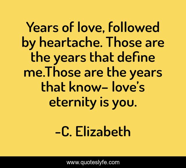 This page presents the quote "Years of love, followed by heartache. Those are the years that define me.Those are the years that know– love’s eternity is you.". Author of this quote is C. Elizabeth. This quote is about eternity, heartache, lovers, lost, loss, years-past, marriage, love-lost, heart-ache,.