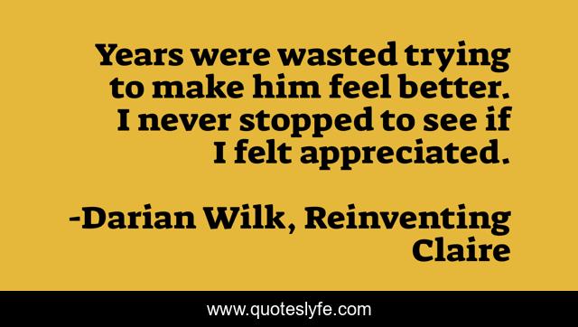 This page presents the quote "Years were wasted trying to make him feel better. I never stopped to see if I felt appreciated.". Author of this quote is Darian Wilk, Reinventing Claire. This quote is about breakup, under-appreciated, regrets,.