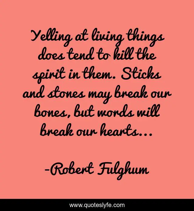 This page presents the quote "Yelling at living things does tend to kill the spirit in them. Sticks and stones may break our bones, but words will break our hearts...". Author of this quote is Robert Fulghum. .