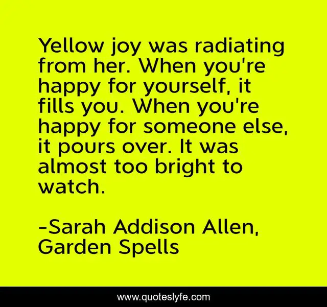 This page presents the quote "Yellow joy was radiating from her. When you're happy for yourself, it fills you. When you're happy for someone else, it pours over. It was almost too bright to watch.". Author of this quote is Sarah Addison Allen, Garden Spells. .