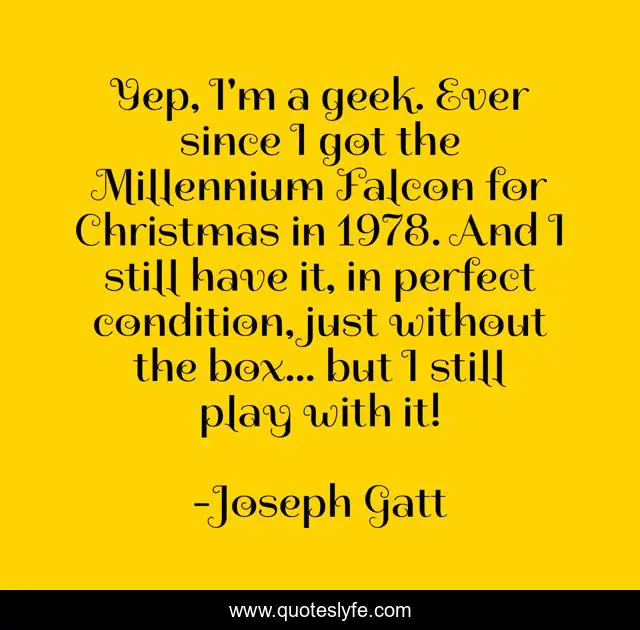This page presents the quote "Yep, I'm a geek. Ever since I got the Millennium Falcon for Christmas in 1978. And I still have it, in perfect condition, just without the box... but I still play with it!". Author of this quote is Joseph Gatt. This quote is about perfect, box, play,.