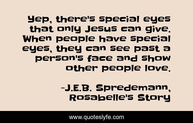 This page presents the quote "Yep, there's special eyes that only Jesus can give. When people have special eyes, they can see past a person's face and show other people love.". Author of this quote is J.E.B. Spredemann, Rosabelle's Story. This quote is about jesus-christ, love, christ, god, appearance, true-beauty, jesus, fairy-tales, understanding,.