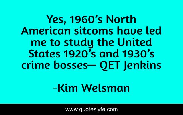 This page presents the quote "Yes, 1960’s North American sitcoms have led me to study the United States 1920’s and 1930’s crime bosses— QET Jenkins". Author of this quote is Kim Welsman. This quote is about fantasy, women-s-fiction, science-fiction, thriller,.