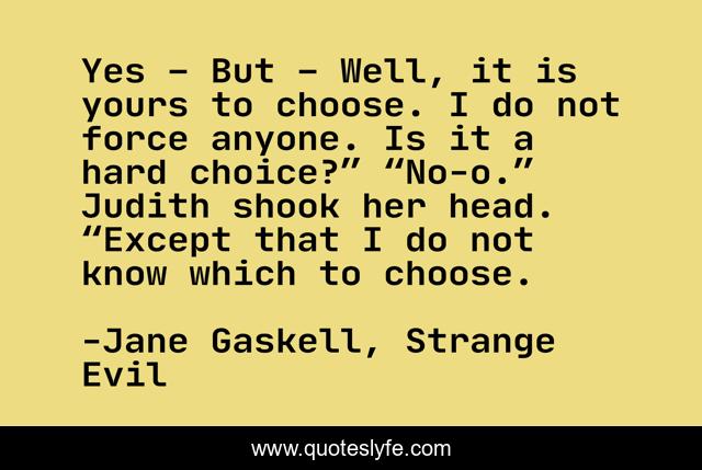 This page presents the quote "Yes – But – Well, it is yours to choose. I do not force anyone. Is it a hard choice?” “No-o.” Judith shook her head. “Except that I do not know which to choose.". Author of this quote is Jane Gaskell, Strange Evil. This quote is about decisions, choices,.
