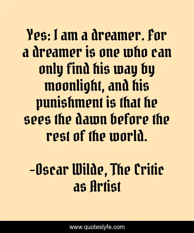 This page presents the quote "Yes: I am a dreamer. For a dreamer is one who can only find his way by moonlight, and his punishment is that he sees the dawn before the rest of the world.". Author of this quote is Oscar Wilde, The Critic as Artist. This quote is about imagination, dreams, dreaming,.