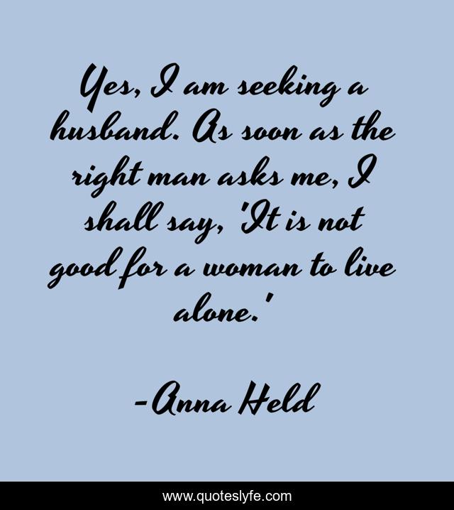 This page presents the quote "Yes, I am seeking a husband. As soon as the right man asks me, I shall say, 'It is not good for a woman to live alone.'". Author of this quote is Anna Held. This quote is about alone, good,.