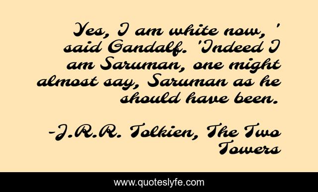 This page presents the quote "Yes, I am white now, ' said Gandalf. 'Indeed I am Saruman, one might almost say, Saruman as he should have been.". Author of this quote is J.R.R. Tolkien, The Two Towers. This quote is about reincarnation, transformation,.