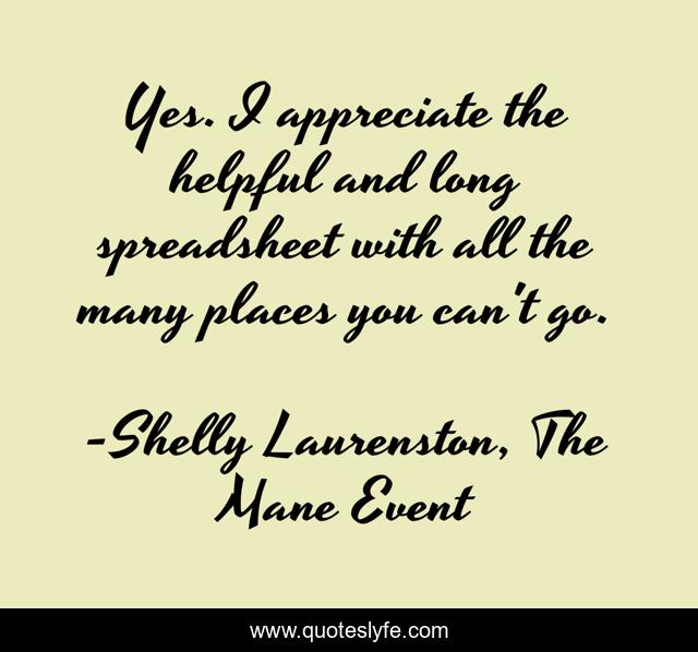 This page presents the quote "Yes. I appreciate the helpful and long spreadsheet with all the many places you can't go.". Author of this quote is Shelly Laurenston, The Mane Event. This quote is about shifters, pride, ronnie, brendon,.