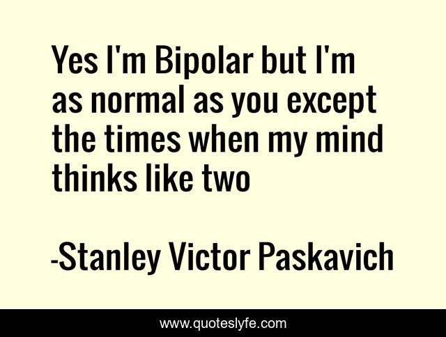 This page presents the quote "Yes I'm Bipolar but I'm as normal as you except the times when my mind thinks like two". Author of this quote is Stanley Victor Paskavich. This quote is about bipolar, bipolar-disorder, mental-illness,.