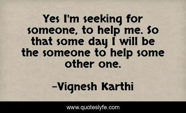 This page presents the quote "Yes I'm seeking for someone, to help me. So that some day I will be the someone to help some other one.". Author of this quote is Vignesh Karthi. This quote is about needs, someone, help, something, need, journey-of-life,.