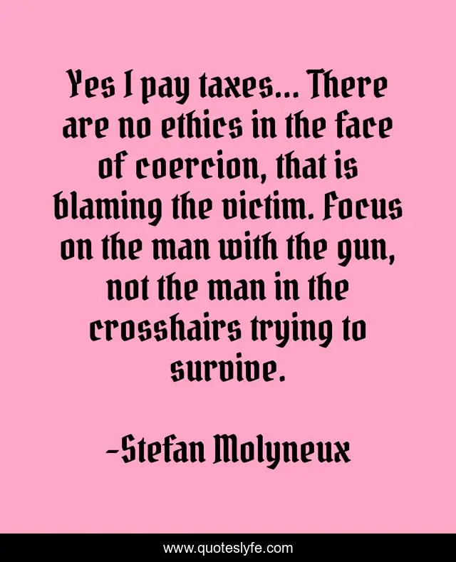 This page presents the quote "Yes I pay taxes... There are no ethics in the face of coercion, that is blaming the victim. Focus on the man with the gun, not the man in the crosshairs trying to survive.". Author of this quote is Stefan Molyneux. This quote is about freedom, taxation, statism, anarchy, theft, voluntaryism,.