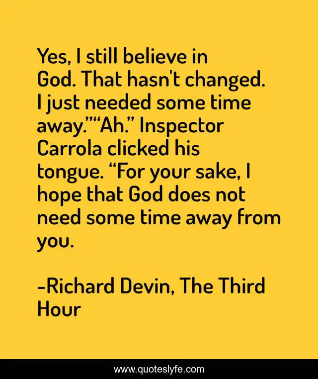 This page presents the quote "Yes, I still believe in God. That hasn't changed. I just needed some time away.”“Ah.” Inspector Carrola clicked his tongue. “For your sake, I hope that God does not need some time away from you.". Author of this quote is Richard Devin, The Third Hour. .