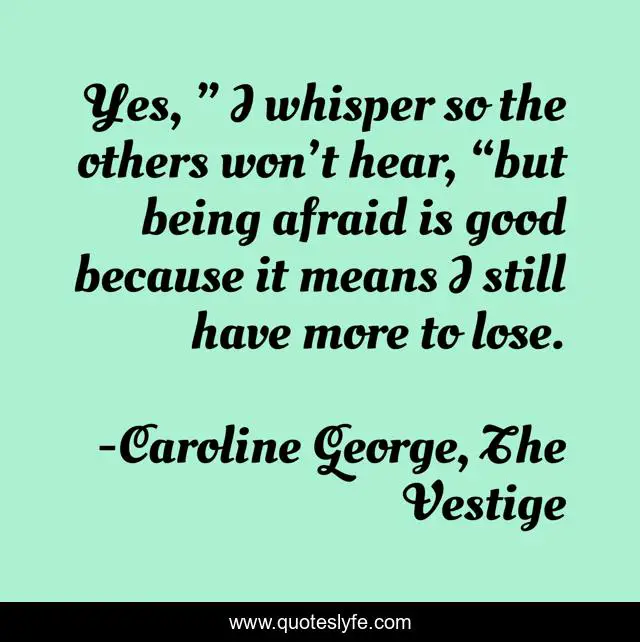 This page presents the quote "Yes, ” I whisper so the others won’t hear, “but being afraid is good because it means I still have more to lose.". Author of this quote is Caroline George, The Vestige. This quote is about the-end-of-the-world, loss, strength, survival, young-adult-fiction, fear,.