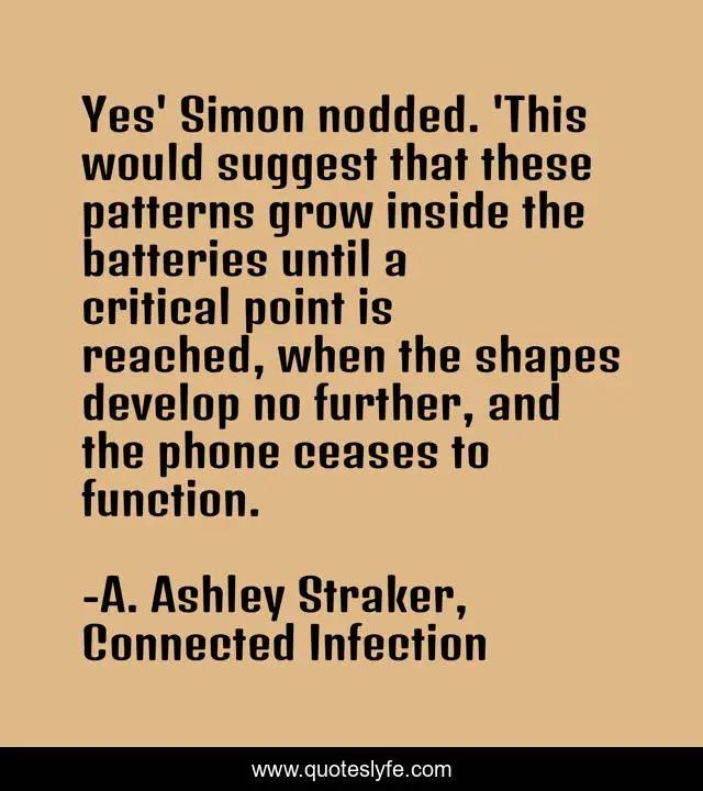This page presents the quote "Yes' Simon nodded. 'This would suggest that these patterns grow inside the batteries until a critical point is reached, when the shapes develop no further, and the phone ceases to function.". Author of this quote is A. Ashley Straker, Connected Infection. This quote is about mobile-phone, horror, alien, cell-phone, technology, thriller, creatures,.