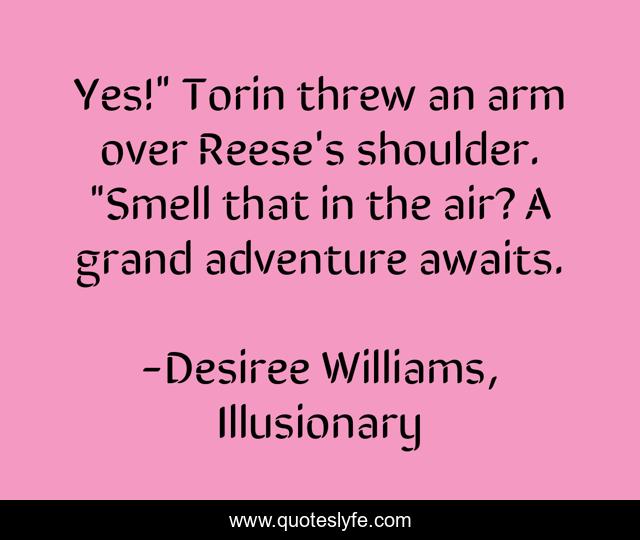 This page presents the quote "Yes!" Torin threw an arm over Reese's shoulder. "Smell that in the air? A grand adventure awaits.". Author of this quote is Desiree Williams, Illusionary. This quote is about fantasy, friendship, adventure,.