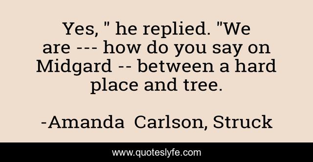 This page presents the quote "Yes, " he replied. "We are --- how do you say on Midgard -- between a hard place and tree.". Author of this quote is Amanda Carlson, Struck. This quote is about greek-mytholody, urban-fantasy, paranormal-romance,.