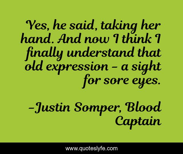 This page presents the quote "Yes, he said, taking her hand. And now I think I finally understand that old expression - a sight for sore eyes.". Author of this quote is Justin Somper, Blood Captain. This quote is about vampirates, grace, lorcan,.