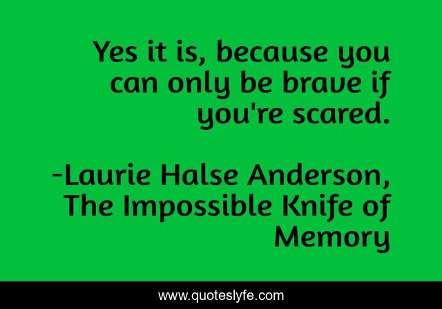 This page presents the quote "Yes it is, because you can only be brave if you're scared.". Author of this quote is Laurie Halse Anderson, The Impossible Knife of Memory. This quote is about confidence, good, the-impossible-knife-of-memory, scared, motivational, laurie-halse-anderson, brave, optimistic, inspirational,.