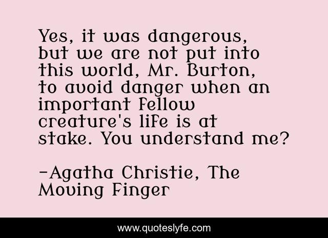 This page presents the quote "Yes, it was dangerous, but we are not put into this world, Mr. Burton, to avoid danger when an important fellow creature's life is at stake. You understand me?". Author of this quote is Agatha Christie, The Moving Finger. This quote is about danger, honor, nobility, miss-marple,.