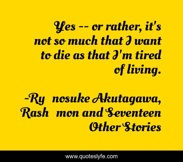 This page presents the quote "Yes -- or rather, it's not so much that I want to die as that I'm tired of living.". Author of this quote is Ryūnosuke Akutagawa, Rashōmon and Seventeen Other Stories. This quote is about death, suicide,.