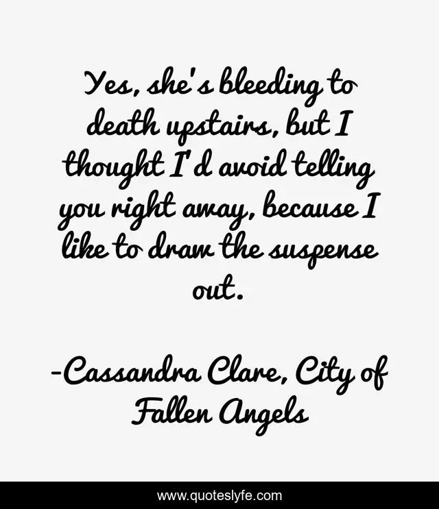 This page presents the quote "Yes, she's bleeding to death upstairs, but I thought I'd avoid telling you right away, because I like to draw the suspense out.". Author of this quote is Cassandra Clare, City of Fallen Angels. This quote is about clary-fray, jace, suspense, izzy,.