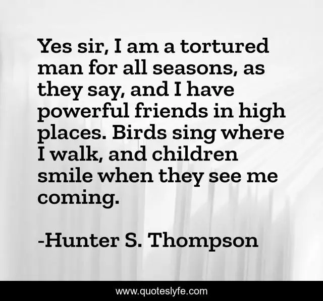 This page presents the quote "Yes sir, I am a tortured man for all seasons, as they say, and I have powerful friends in high places. Birds sing where I walk, and children smile when they see me coming.". Author of this quote is Hunter S. Thompson. This quote is about friends, children, man,.