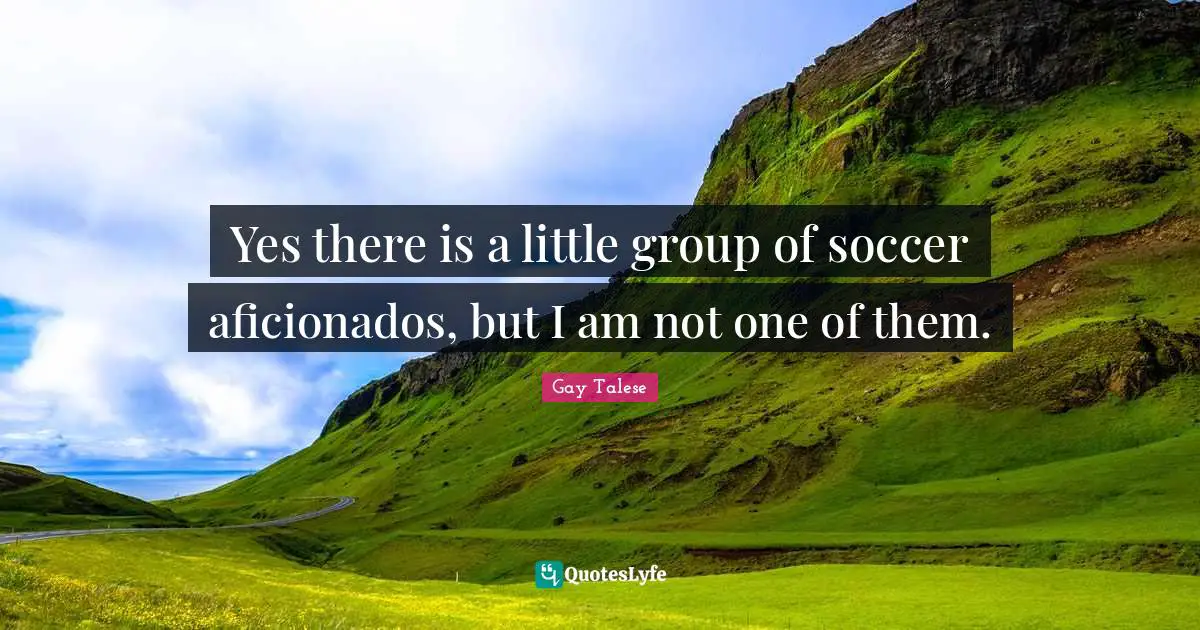 This page presents the quote "Yes there is a little group of soccer aficionados, but I am not one of them.". Author of this quote is Gay Talese. This quote is about soccer, groups, littles,.