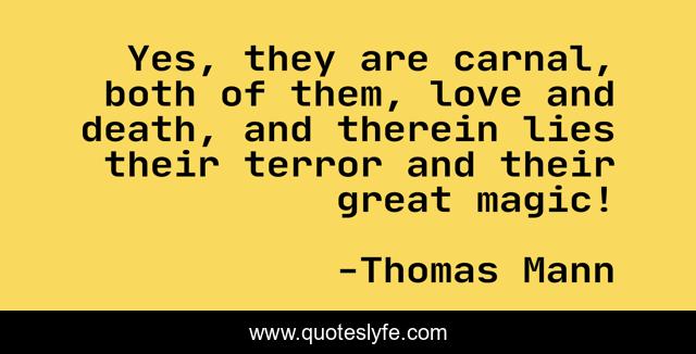 This page presents the quote "Yes, they are carnal, both of them, love and death, and therein lies their terror and their great magic!". Author of this quote is Thomas Mann. This quote is about death, love, affection,.