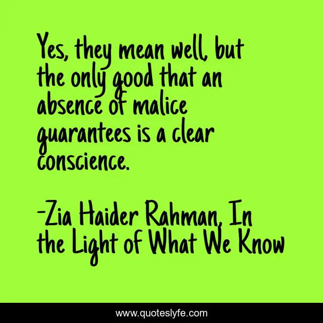 This page presents the quote "Yes, they mean well, but the only good that an absence of malice guarantees is a clear conscience.". Author of this quote is Zia Haider Rahman, In the Light of What We Know. This quote is about conscience, afghanistan, malice,.