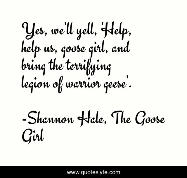 This page presents the quote "Yes, we'll yell, 'Help, help us, goose girl, and bring the terrifying legion of warrior geese'.". Author of this quote is Shannon Hale, The Goose Girl. This quote is about goose, sarcasm, isi, humor,.