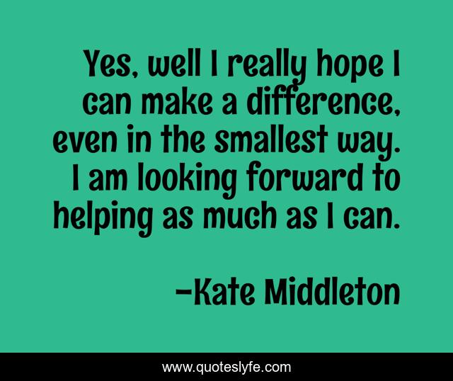This page presents the quote "Yes, well I really hope I can make a difference, even in the smallest way. I am looking forward to helping as much as I can.". Author of this quote is Kate Middleton. .