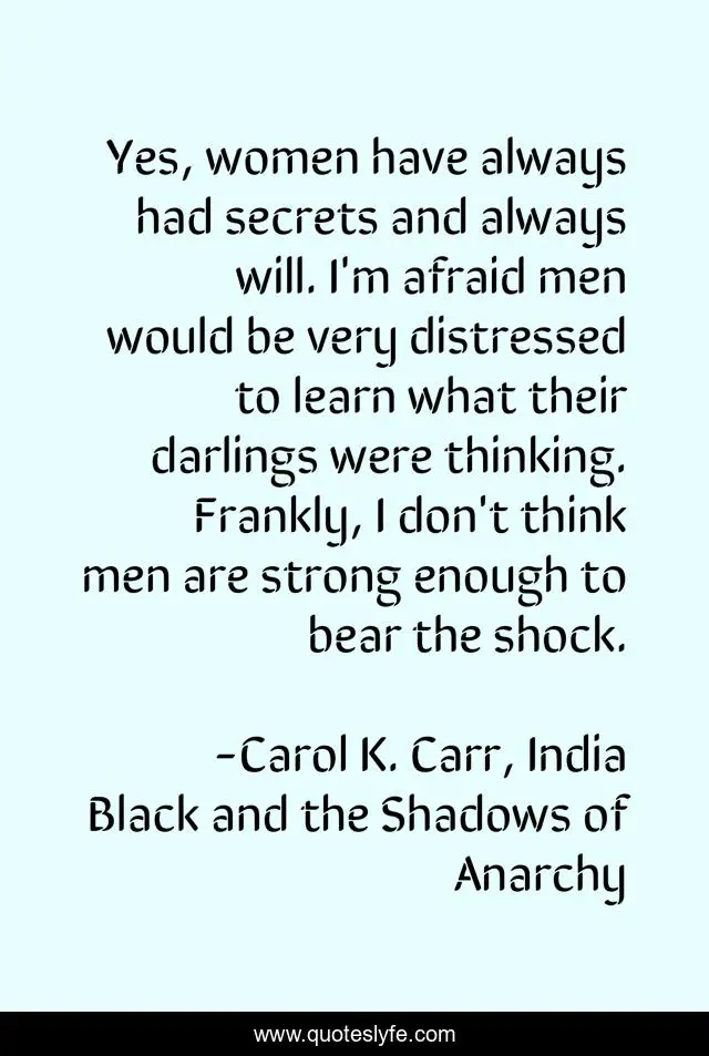 This page presents the quote "Yes, women have always had secrets and always will. I'm afraid men would be very distressed to learn what their darlings were thinking. Frankly, I don't think men are strong enough to bear the shock.". Author of this quote is Carol K. Carr, India Black and the Shadows of Anarchy. This quote is about secrets, men, women,.