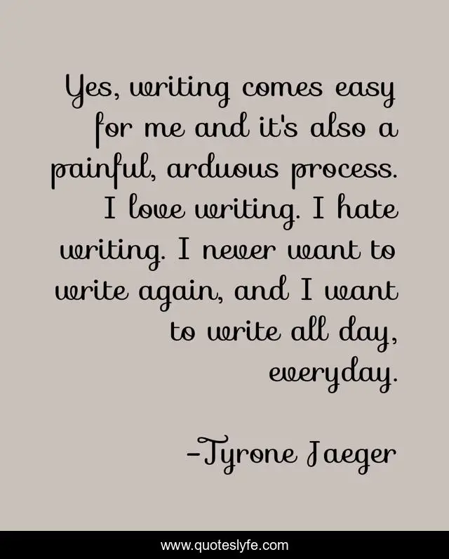 This page presents the quote "Yes, writing comes easy for me and it's also a painful, arduous process. I love writing. I hate writing. I never want to write again, and I want to write all day, everyday.". Author of this quote is Tyrone Jaeger. This quote is about hate, love, affection, writing,.