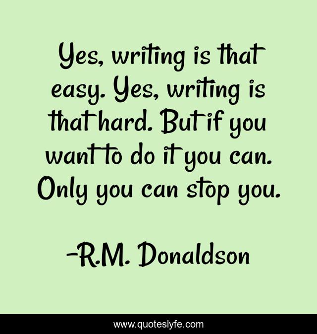 This page presents the quote "Yes, writing is that easy. Yes, writing is that hard. But if you want to do it you can. Only you can stop you.". Author of this quote is R.M. Donaldson. This quote is about writing-advice-process, writing-life, writing, inspirational, enthusiasm, writing-process-writing-advice, inspiration,.