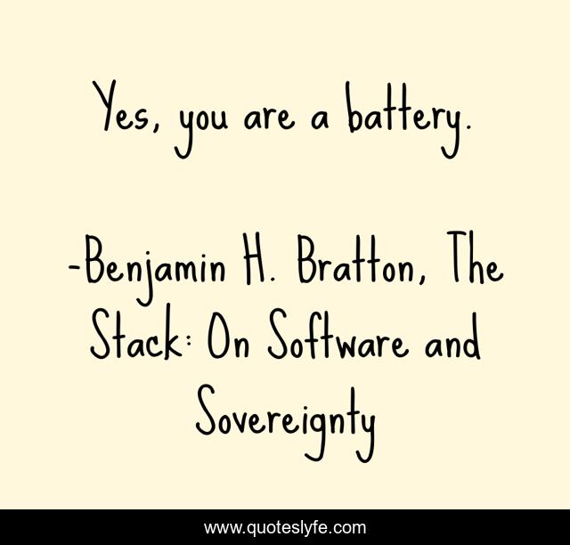 "Benjamin H. Bratton, The Stack: On Software and Sovereignty Quotes." Quoteslyfe.com, 2025. Sat. 06 Dec. 2025. <https://www.quoteslyfe.com/quote/Yes-you-are-a-battery-196558>.