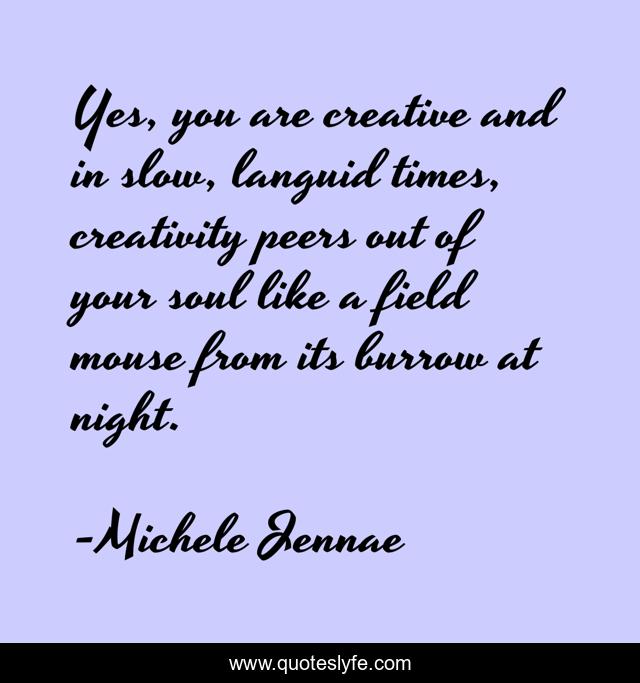 This page presents the quote "Yes, you are creative and in slow, languid times, creativity peers out of your soul like a field mouse from its burrow at night.". Author of this quote is Michele Jennae. This quote is about creativity, creative-process, zen, relaxation,.