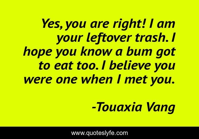 This page presents the quote "Yes, you are right! I am your leftover trash. I hope you know a bum got to eat too. I believe you were one when I met you.". Author of this quote is Touaxia Vang. This quote is about life, love, memories, break-up, pain, affection, self-esteem,.