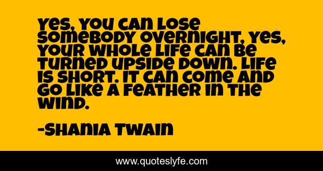 This page presents the quote "Yes, you can lose somebody overnight, yes, your whole life can be turned upside down. Life is short. It can come and go like a feather in the wind.". Author of this quote is Shania Twain. This quote is about short, life is short, wind,.