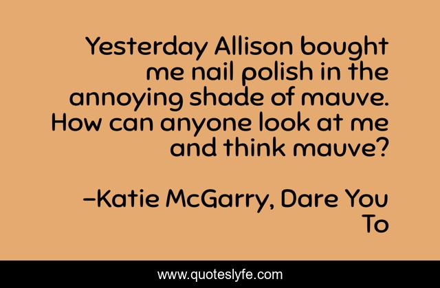 This page presents the quote "Yesterday Allison bought me nail polish in the annoying shade of mauve. How can anyone look at me and think mauve?". Author of this quote is Katie McGarry, Dare You To. This quote is about humor, mauve, makeup, frustration, nail-polish, identity,.