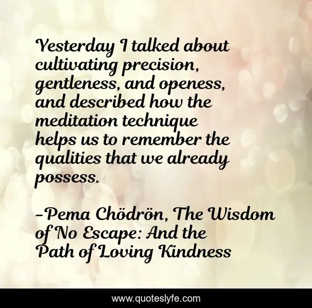 "Pema Chödrön, The Wisdom of No Escape: And the Path of Loving Kindness Quotes." Quoteslyfe.com, 2025. Fri. 05 Dec. 2025. <https://www.quoteslyfe.com/quote/Yesterday-I-talked-about-cultivating-precision-gentleness-118015>.