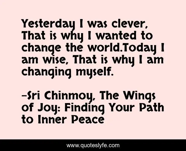 This page presents the quote "Yesterday I was clever, That is why I wanted to change the world.Today I am wise, That is why I am changing myself.". Author of this quote is Sri Chinmoy, The Wings of Joy: Finding Your Path to Inner Peace. .