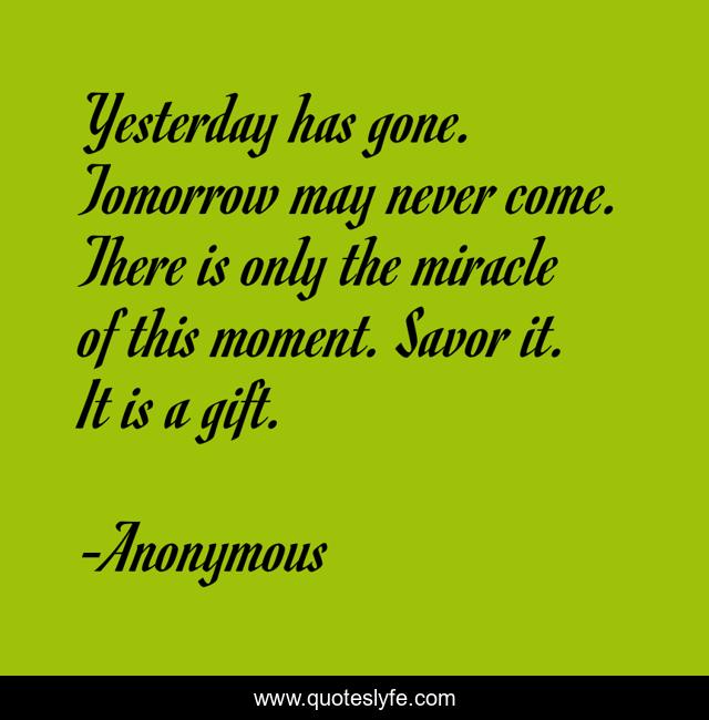 This page presents the quote "Yesterday has gone. Tomorrow may never come. There is only the miracle of this moment. Savor it. It is a gift.". Author of this quote is Anonymous. .