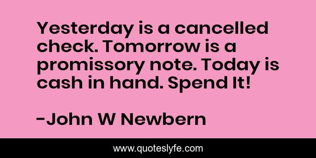 This page presents the quote "Yesterday is a cancelled check. Tomorrow is a promissory note. Today is cash in hand. Spend It!". Author of this quote is John W Newbern. .