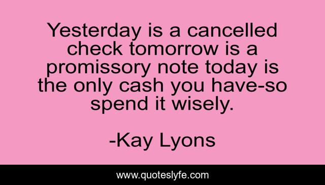 This page presents the quote "Yesterday is a cancelled check tomorrow is a promissory note today is the only cash you have-so spend it wisely.". Author of this quote is Kay Lyons. .