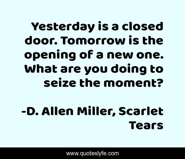 This page presents the quote "Yesterday is a closed door. Tomorrow is the opening of a new one. What are you doing to seize the moment?". Author of this quote is D. Allen Miller, Scarlet Tears. This quote is about self-realization, future, yesterday,.