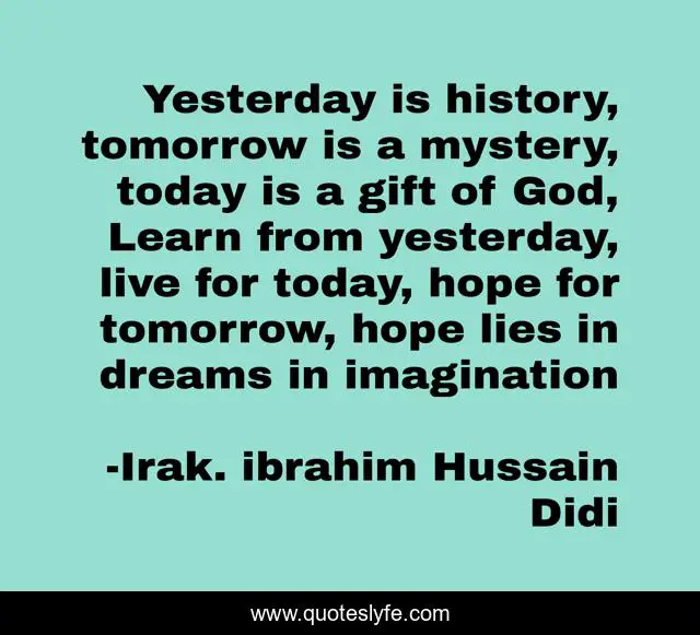 This page presents the quote "Yesterday is history, tomorrow is a mystery, today is a gift of God, Learn from yesterday, live for today, hope for tomorrow, hope lies in dreams in imagination". Author of this quote is Irak. ibrahim Hussain Didi. This quote is about leadership, hope, learn,.