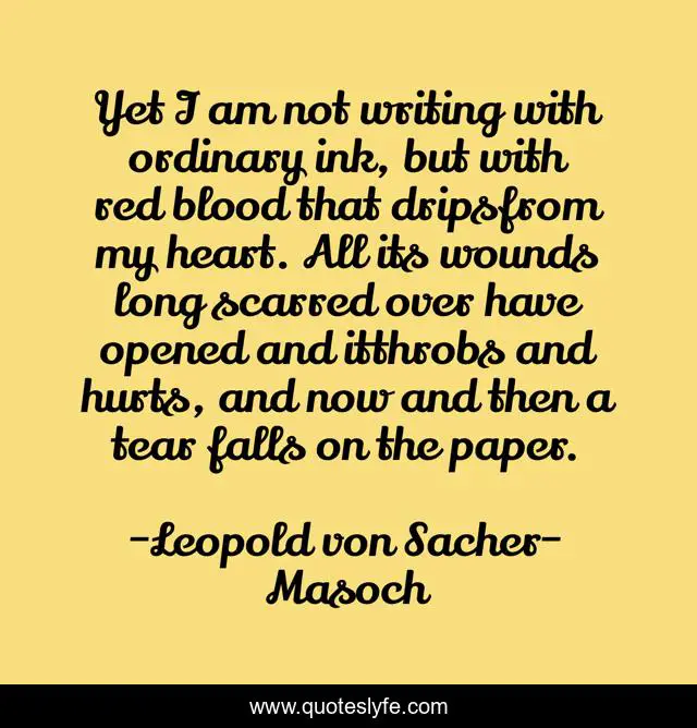 This page presents the quote "Yet I am not writing with ordinary ink, but with red blood that dripsfrom my heart. All its wounds long scarred over have opened and itthrobs and hurts, and now and then a tear falls on the paper.". Author of this quote is Leopold von Sacher-Masoch. This quote is about love, venus, pain, affection, hurt,.