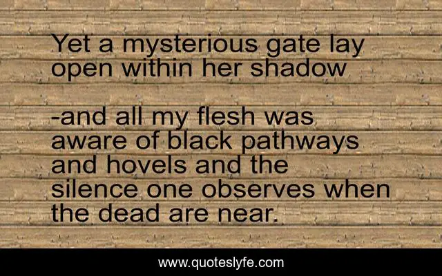 "and all my flesh was aware of black pathways and hovels and the silence one observes when the dead are near. Quotes." Quoteslyfe.com, 2025. Sat. 06 Dec. 2025. <https://www.quoteslyfe.com/quote/Yet-a-mysterious-gate-lay-open-within-226528>.